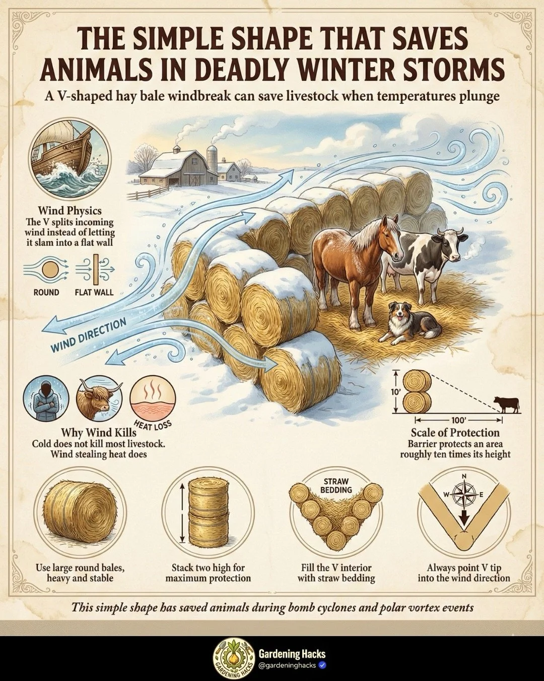 Winter storms can be dangerous for farm animals, mostly due to the severe wind chill rather than just the cold air itself. This clever hay bale setup works by splitting the wind instead of blocking it flat, creating a much calmer and warmer pocket for your horses, cows, or other livestock.